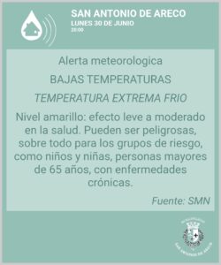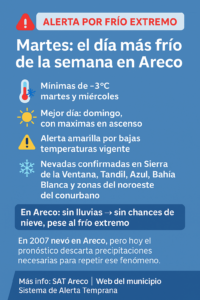 Actualmente, la zona se encuentra bajo alerta amarilla por temperaturas extremas frías, que podría actualizarse diariamente según la evolución de las condiciones meteorológicas. Se recomienda a la población consultar información oficial en la aplicación SAT Areco.