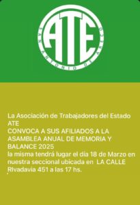 La Asociación de Trabajadores de Estado ATE convoca a sus afiliados a la Asamblea anual de Memoria y Balance