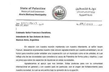 Nuestra ciudad avanza por estos días en un nuevo hermanamiento, esta vez con la localidad de Aizaria, Palestina, para realizar