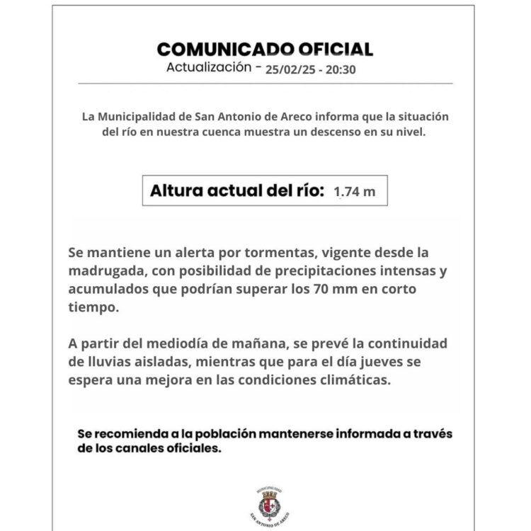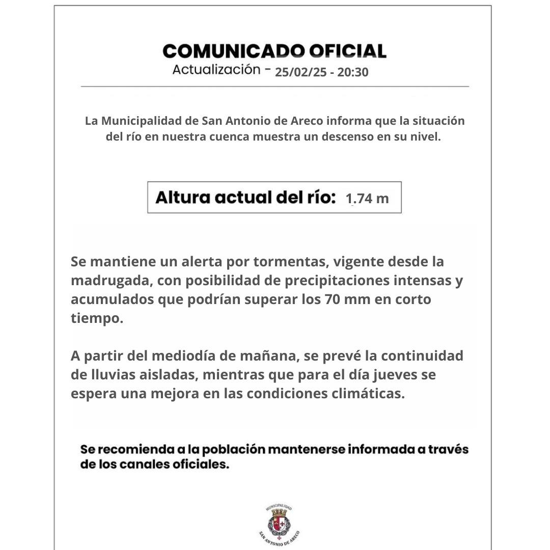 Comunicado oficial sobre altura del río y alerta por tormentas