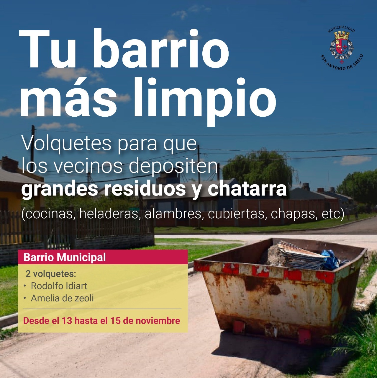 Pensada para que los y las vecinos/as puedan depositar en volquetes grandes residuos y chatarra, a partir de ahora todas las semanas estará en un barrio distinto, y así evitamos de hacerlo en los contenedores de residuos. Para que no se dañen y que los recolectores no tengan que levantar basura que no corresponde.