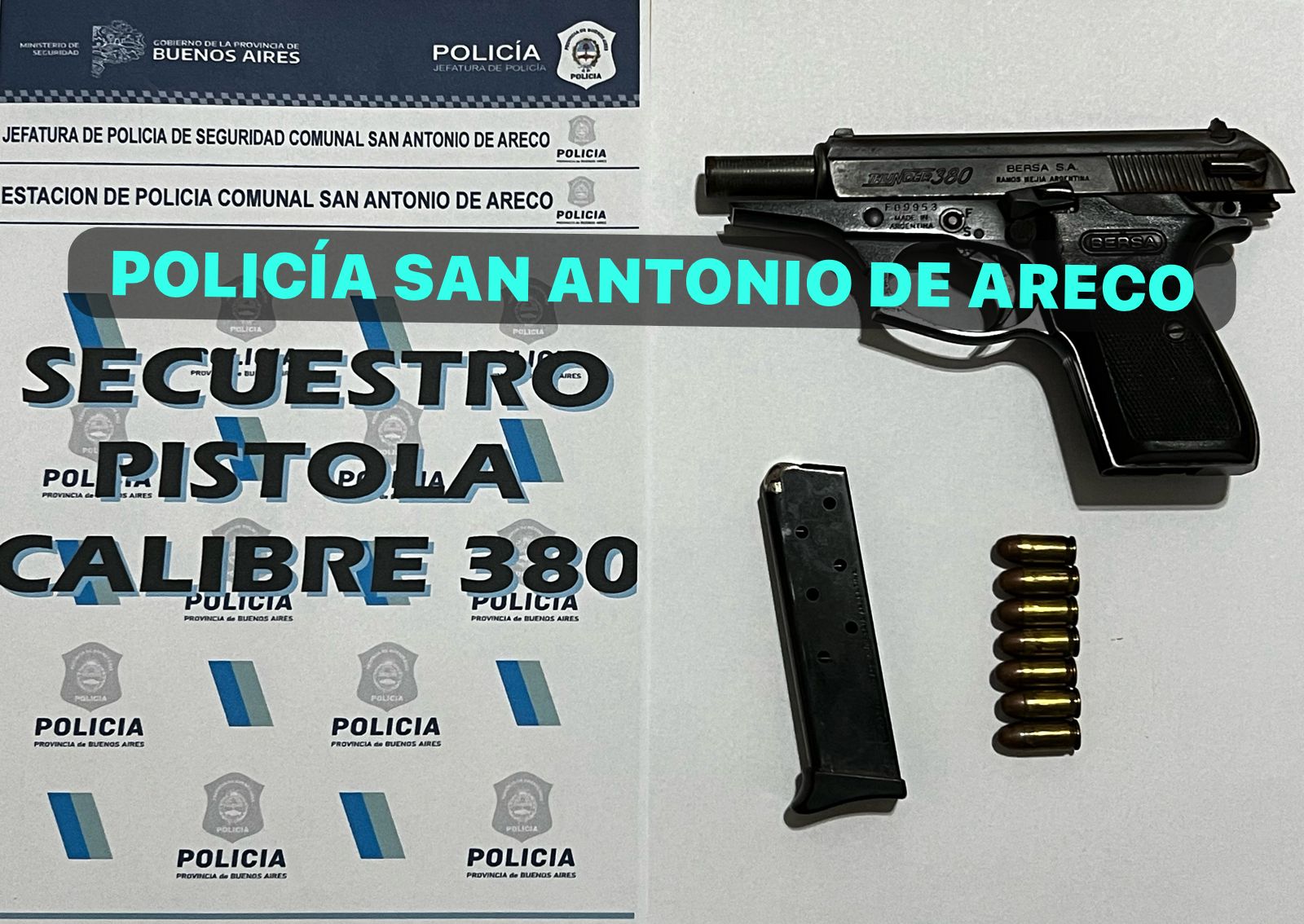 DETENIDO POR PORTACIÓN ILEGAL DE ARMA DE FUEGO: En la noche del día sábado, personal de la Estación de Policía Comunal San Antonio de Areco realizaba recorridas prevencionales, advirtiendo en zona de Costanera Río Areco la presencia de un automóvil ajeno a esta localidad cuyo conductor al divisar la presencia de los uniformados intenta evadir ser identificado, interceptado se advierte dentro del vehículo una escopeta de disuasión, requisado el conductor del automóvil se le extrae de entre sus prendas una pistola semiautomática BERSA THUNDER calibre 380, con cargador de 7 proyectiles colocado y en condiciones inmediatas de uso. Procediéndose de inmediato a la aprehensión del masculino mayor de edad oriundo de la localidad de Zarate el cual es puesto a disposición de la justicia y trasladado a sede judicial en la localidad de Mercedes.