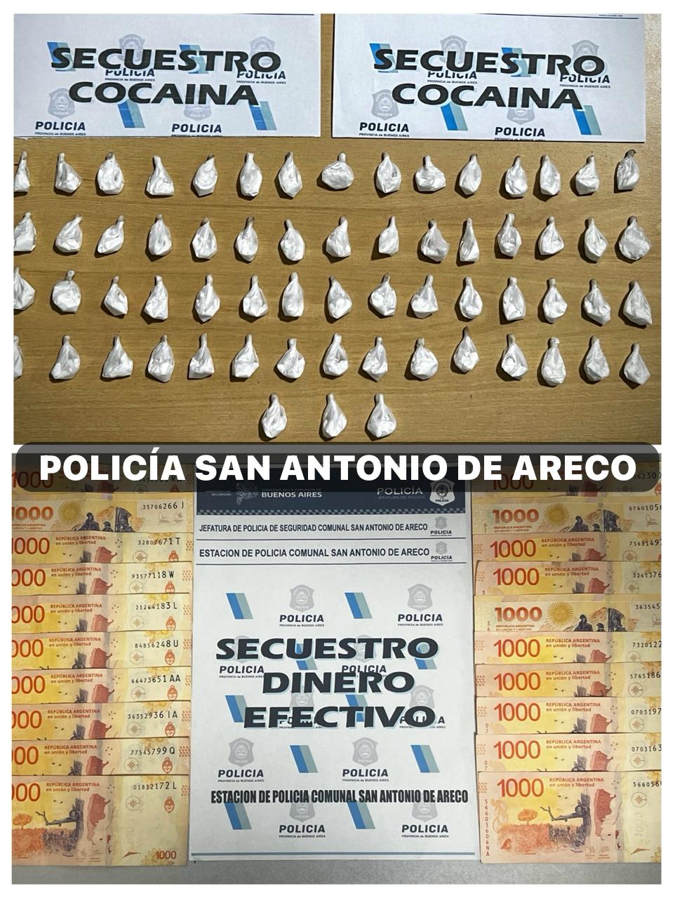DETENCION POR VENTA DE ESTUPEFACIENTES: En los primeros minutos del día de hoy, personal de la Estación de Policía Comunal de San Antonio de Areco, en marco a la prevención de Ilícitos relacionados con la venta de estupefacientes y luego de una ardua tarea de reunión y recolección de información, establecen que desde Villa Rosa, partido de Pilar, se presentaba un masculino apodado “Mingo” el cual en nuestra ciudad practicaba la venta de droga. Implementado un importante operativo de seguimiento en vehículos particulares y patrulleros se logra interceptar un automóvil Chevrolet Celta color gris del cual se demora a su conductor, practicada requisa sobre el interior del vehículo se procede al hallazgo de más de 60 dosis de cocaína de alta pureza, un trozo de marihuana, telefonía celular y dinero en efectivo. Ante ello se procede a la inmediata aprehensión del masculino. Iniciadas las actuaciones judiciales se establece que pesa sobre el mismo orden de detención, solicitada por el Juzgado Federal de Venado Tuerto, Santa Fe, en relación de infracción a la Ley de Drogas, en tal sentido una vez que preste declaración ante la Fiscalía temática, hará lo pronto ante la Justicia Federal.