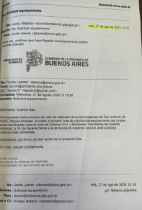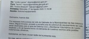 Pero esos mismos mensajes revelan lo contrario: una gestión informal, fuera de norma y sin escalamiento político, que demoró cinco meses la llegada del kit de emergencia climática finalmente conseguido por Bomberos y vecinas inundadas, no por el municipio.