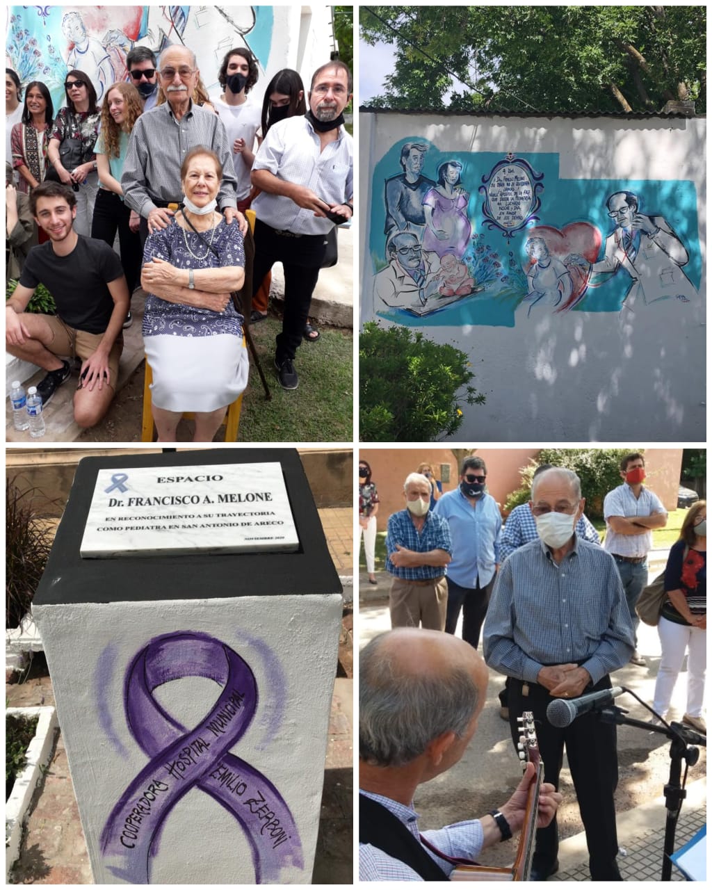 Con el privilegio de aquellos que han seguido una conducta ejemplar a lo largo de su vida, la cooperadora del Hospital Emilio Zerboni realizó este sábado un merecido homenaje al doctor Francisco Melone. Acompañado por su familia – esposa, hijos y nietos – quien fuera distinguido pediatra en nuestra ciudad, fue testigo del reconocimiento, como curiosamente comentó más de una vez a sus íntimos. “A él siempre le gustaron los homenajes en vida” comentó a este medio su hijo Ricardo Melone, luego de los discursos del presidente Raúl Marchi y otros miembros de la cooperadora y del descubrimiento del mural creado por Miguelangel Gasparini.