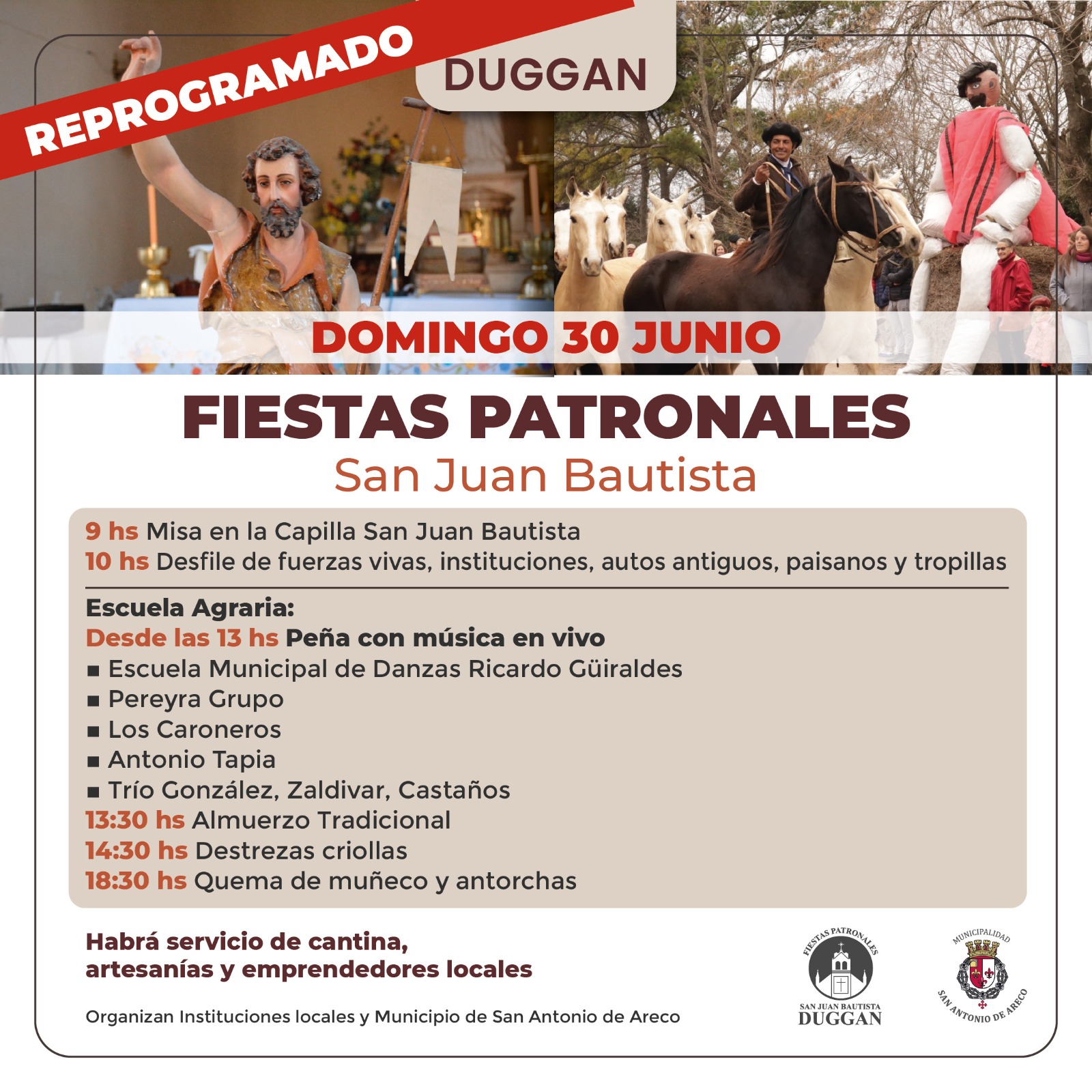 • 9 hs en adelante: Fiestas Patronales de San Juan Bautista en Duggan. Servicio de cantina, artesanías  y emprendedores locales. Peña, almuerzo tradicional, destrezas criollas, quema del muñeco y antorchas.