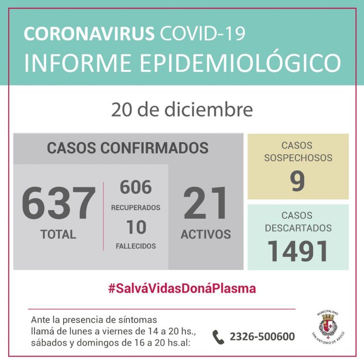 Con 21 activos y 9 sospechosos, nuestra ciudad suma 637 casos de COVID-19 en total.