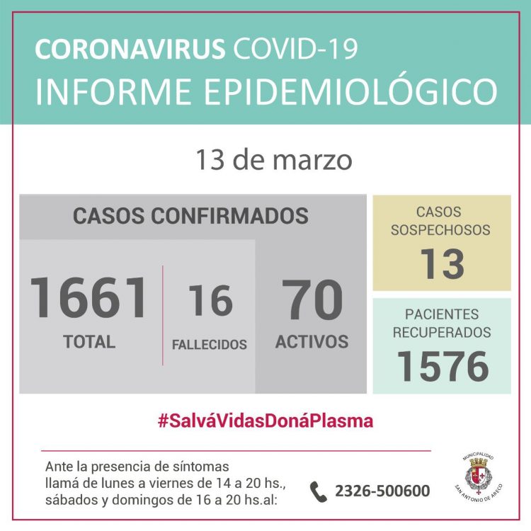 Con las cifras publicadas, nuestra ciudad registra 16 pacientes fallecidos. En la actualidad permanecen activos 70 pacientes con un total de 1576 recuperados.