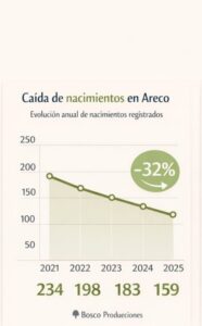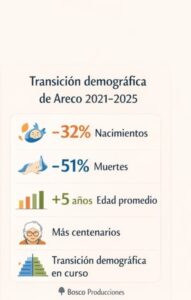 Entre 2021 y 2025, los nacimientos en San Antonio de Areco cayeron un 32%. En el mismo período, la mortalidad total descendió 51%, mientras la edad promedio al fallecer aumentó aproximadamente cinco años.