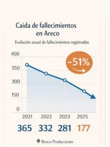 A partir de 2022 comienza una caída sostenida de la mortalidad total: 332 en 2022, 281 en 2023, 231 en 2024 y 177 en 2025.