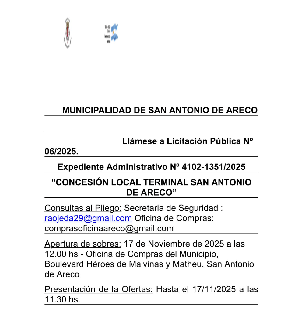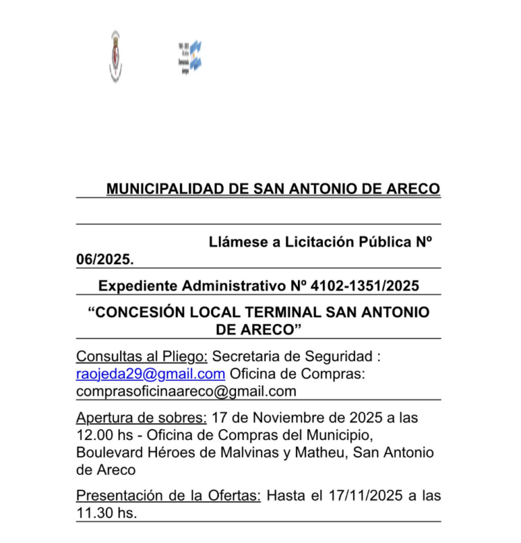 La Municipalidad de San Antonio de Areco llama a Licitación Pública Nº 06/2025, correspondiente al otorgamiento de la concesión del local de la Terminal de Ómnibus de San Antonio de Areco.