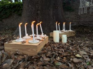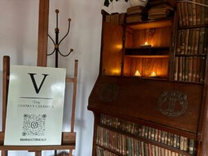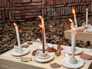 Ese volver a modelar con las manos, a dejar que el fuego del horno transforme la arcilla en luz, marcó el tono de toda la muestra. Cada pieza fue pensada como un pequeño faro, una invitación a la calma, al tiempo detenido. “Era re lindo darle luz, de algún modo, a la biblioteca -dice-  sabíamos que entre los estantes oscuros de libros antiguos, las velas iban a resaltar. Y que esa luz podía invitar a leer, a volver a investigar, a sentarse como antes”.
