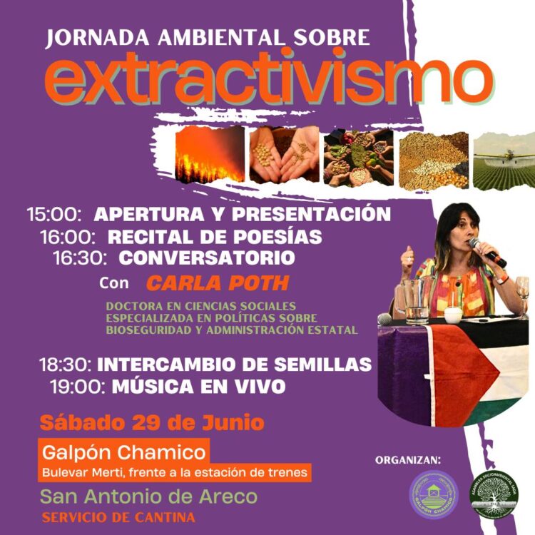 El próximo sábado 29 de junio, desde la Asamblea Socioambiental de San Antonio de Areco invita a la comunidad a la 2da Jornada Ambiental sobre Extrativismo, que se realizará en el Galpón Chamico, bulevar Merti y Gorordo.
