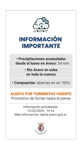 En cuanto a la situación del río, constante preocupación de los vecinos, “hasta hoy – por el miércoles – tuvimos el río muy bajo. No habíamos visto variación en el nivel, teniendo en cuenta las precipitaciones. Pero con toda esta agua que sabíamos que llevaba de río arriba, de algunos lugares como Tres Sargentos y demás, nosotros sabemos que esperamos toda esa agua”. En ese sentido, aclaró la meteoróloga, “lo vamos viendo y monitoreando momento a momento. En la última actualización fue de las ocho de la noche, estamos en un metro sesenta acá en Areco, todavía dentro del cauce. Tenemos que, para tener una referencia, más o menos hasta los tres metros, el río se encuentra adentro del cauce. Tal vez pasamos y lo vemos lleno, pero hasta los tres metros está dentro del cauce. Lo que sí estamos viendo es que viene subiendo despacito unos diez centímetros por hora, si le queremos poner un número. Así que bueno, lo venimos monitoreando, lo venimos siguiendo. Y lo que sí no sabemos es todavía cómo se va a seguir comportando, porque en Carmen de Areco todavía no es que empezó a bajar, sino que continúa subiendo”. Mientras tanto, la alerta “está vigente hasta mañana en la mañana. Lo que sabemos es que hay distintas tormentas puntuales que podrían llegar a afectar“.