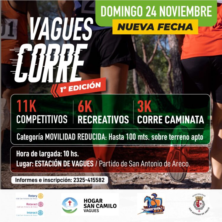 Realizada por primera vez en esa localidad, “Vagues Corre” será una maratón Cross Country, con circuitos que requieren de inscripción de 3, 6 y 11 km. También se realizará una carrera gratuita de 1.5 km para niños y otra para personas de movilidad reducida. Habrá servicio de cantina a beneficio de Rotaract y el Hogar San Camilo.